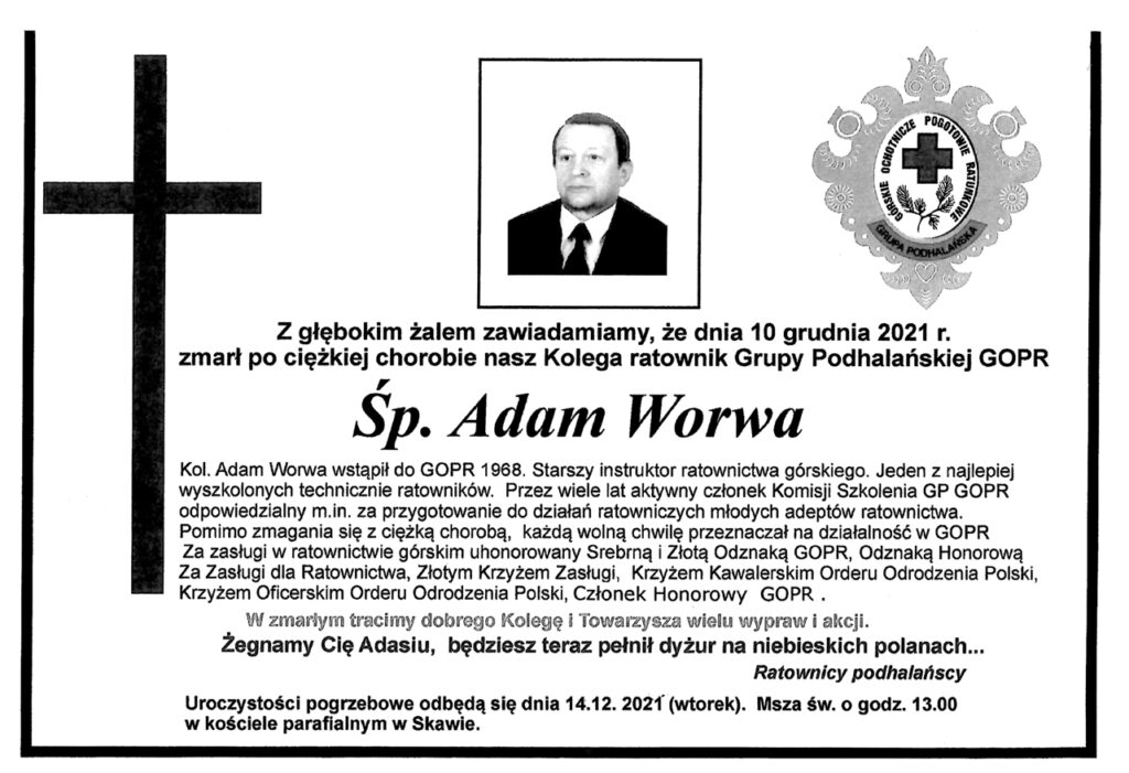 Adam Worwa był ratownikiem Sekcji Operacyjnej Rabka Grupy Podhalańskiej GOPR, a od dnia 08.12.2018 r. Honorowym Członkiem GOPR.