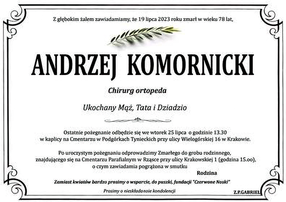 Dr Andrzej Komornicki zmarł w Krakowie 19 lipca 2023 r.