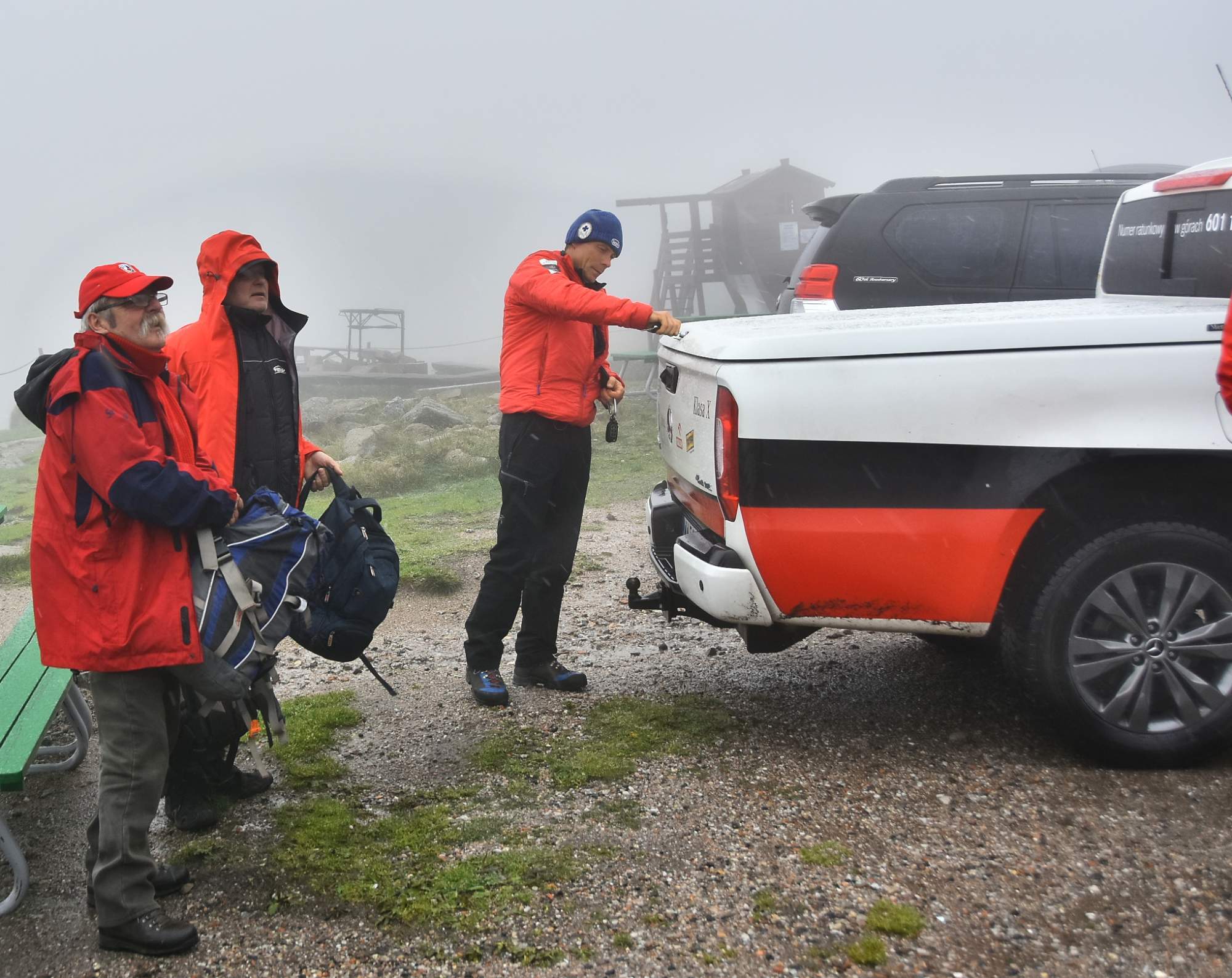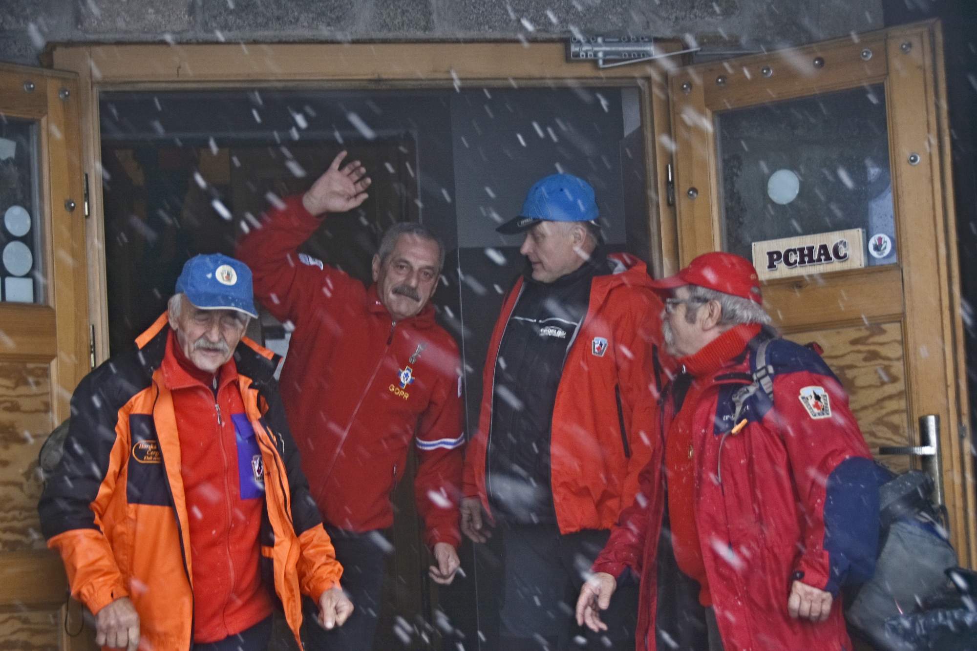 Privítali nás ratovnici, ktorí mali práve službu veľmi milo a s radosťou. Pretože vonku pršalo a cesta lanovkou do Hali Szrenickej nebola možná, museli sme počkať na auto ktoré nás odviezlo na miesto slávnostnej akcie, ale strávili sme čas čakania v prijemnej atmsfere s tamojšími priateľmi ratovnikmi.