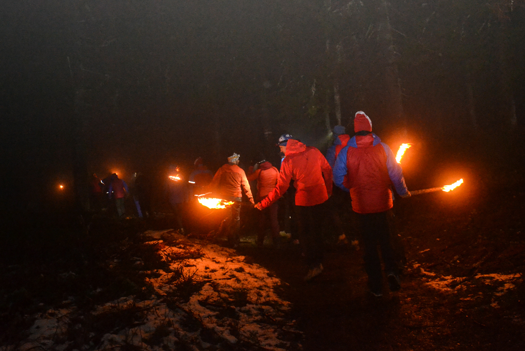 Po części oficjalnej uformował się przed schroniskiem długi pochód, który przy blasku pochodni udał się na nieodległy szczyt Turbacza. Młodsi stażem koledzy wyruszyli na szczyt kilka minut po wszystkich, prowadzeni przez poczet sztandarowy Grupy Podhalańskiej GOPR oraz kapelę górską, przy dźwiękach której zostali doprowadzeni do rozpalonej watry i symbolicznie weszli w krąg czekających na nich kolegów.