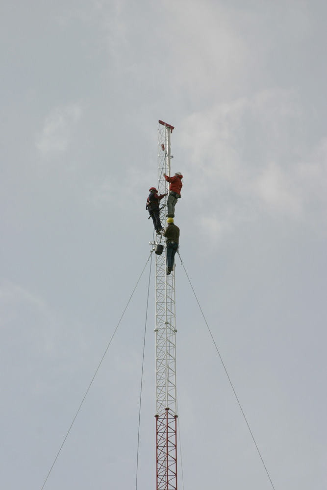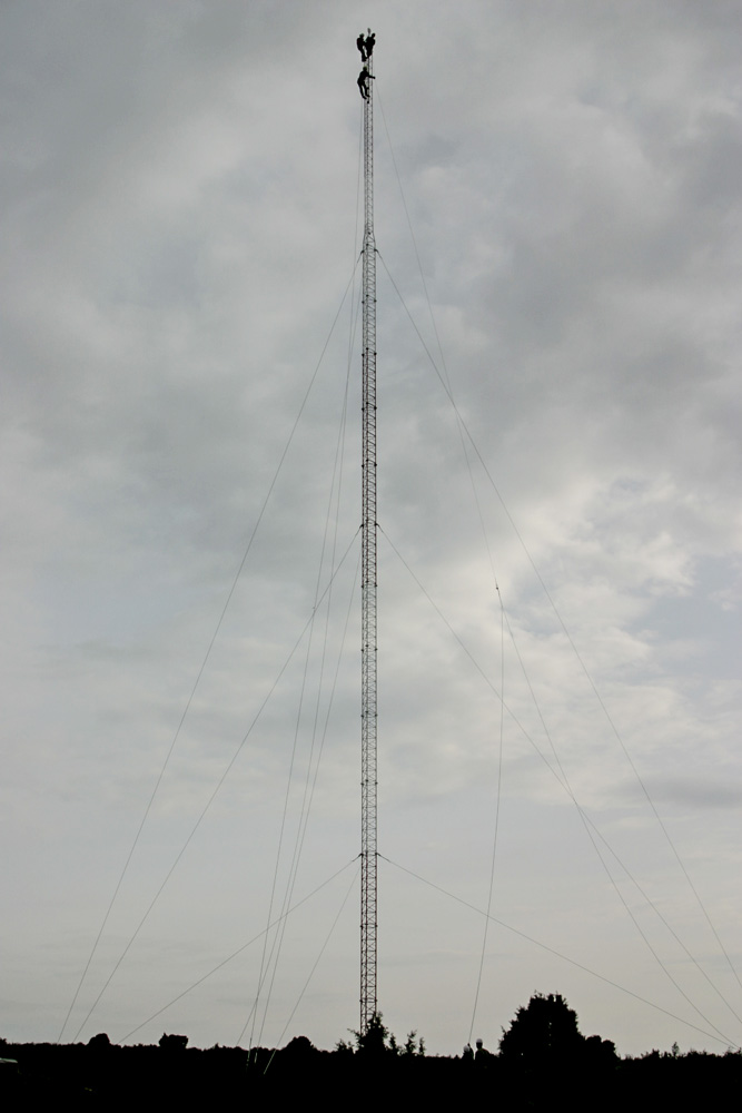 Drugi dzień pracy był intensywny, maszt ,,rósł’’ do nieba i bujał się na prawo i lewo do momentu usztywnienia go stalowymi linami. Wiatr świszczał w uszach, a widoki z wysokości na całą okolicę były wspaniałe.