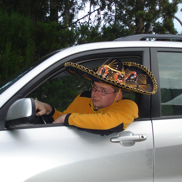 Buenos días Barcelona! Piękne miasto, widziane z okna samochodu, szybko przejechaliśmy wynajętym samochodem. Na obrzeżach zanocowaliśmy w domu jednorodzinnym. Rano mieliśmy jechać w rejon La Rioja, gdzie mieliśmy postawić ten maszt. Po przebudzeniu wszyscy gorączkowo szukaliśmy kawy do śniadania, której nie znaleźliśmy we wskazanej szafce kuchennej. Znaleźliśmy za to duże i barwne sombrero, i furażerkę z czasów generała Franco. Z tej okazji rozpoczęliśmy spontaniczną sesję zdjęciową.