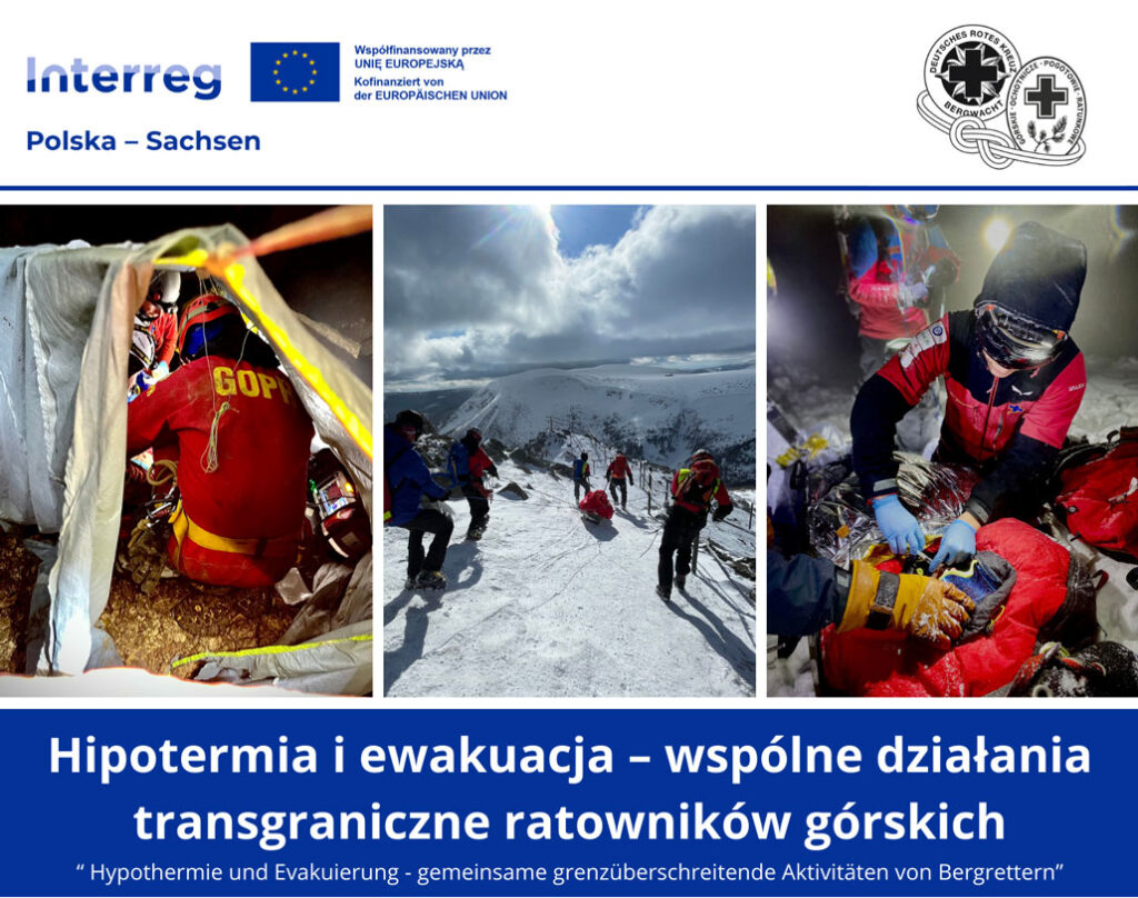 Projekt „Hipotermia i ewakuacja – wspólne działania transgraniczne ratowników górskich” jest współfinansowany przez Unię Europejską ze środków Europejskiego Funduszu Rozwoju Regionalnego w ramach Funduszu Małych Projektów Polska – Saksonia 2021-2027 i ze środków budżetu Państwa.