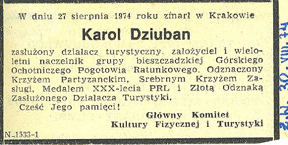 Nie wiem, czy Kolegom z Grupy Bieszczadzkiej było kiedykolwiek wiadomo, jak bardzo i jak konsekwentnie Pan Karol walczył o Ich interesy. W czasach kiedy razem pracowaliśmy, do moich zadań należało m.in. protokołowanie posiedzeń GOPR. Pamiętam, że z przyjemnością słuchałam wszystkich wystąpień Pana Dziubana, który okazując szacunek ówczesnym Autorytetom dawał jednocześnie w znakomity sposób do zrozumienia, że i On i ratownicy Grupy Bieszczadzkiej oczekują takiegoż szacunku w zamian.