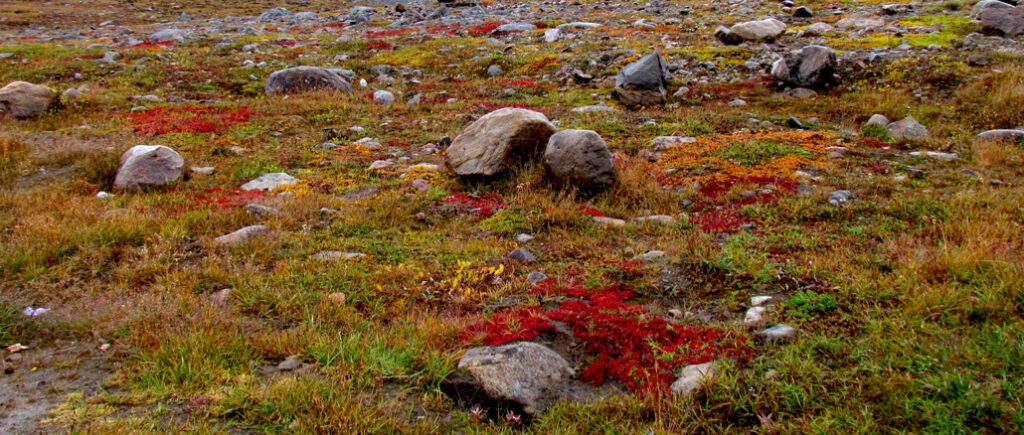Nie widzę ziemi, ale za chwilę jest. Jesteśmy nie więcej niż 50m powyżej skalistej płyty i sporadycznych grupek niskich świerków. Wyższych tu nie ma. Długa, ciemna zima, niskie temperatury i hulające wiatry, nie stanowią dogodnych warunków dla wybujałej wegetacji.