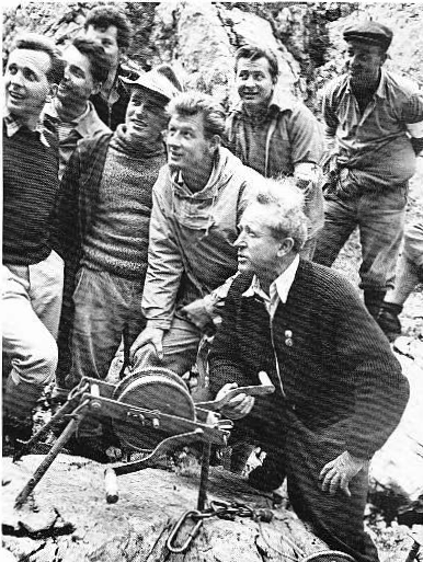 Ludwig Gramminger przy zestawie własnej konstrukcji – źródło: http://www.alpinwiki.at/erstbesteiger/gramminger-ludwig