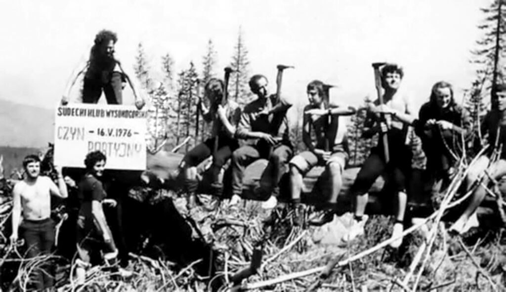Z tego epizodu zostało mi jedno zdjęcie naszego czynu (partyjnego) na wiatrołomie. Wtedy byliśmy zmotywowani do działań dających nam możliwości na wyjazdy klubowe w góry.
