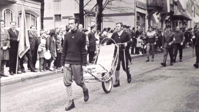 W moich zbiorach jest takie zdjęcie; Pochód pierwszomajowy w Szklarskiej Porębie, idziemy z wózkiem alpejskim. Włodek, który był przeciwny takim demonstracjom, tym razem zgodził się „dla propagandy”. Oto jak się wtedy prezentowaliśmy: